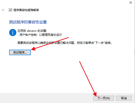 注意在点击测试程序后,程序会管理员权限运行,可以关闭后点击下一页,点击为此程序保存这些设置